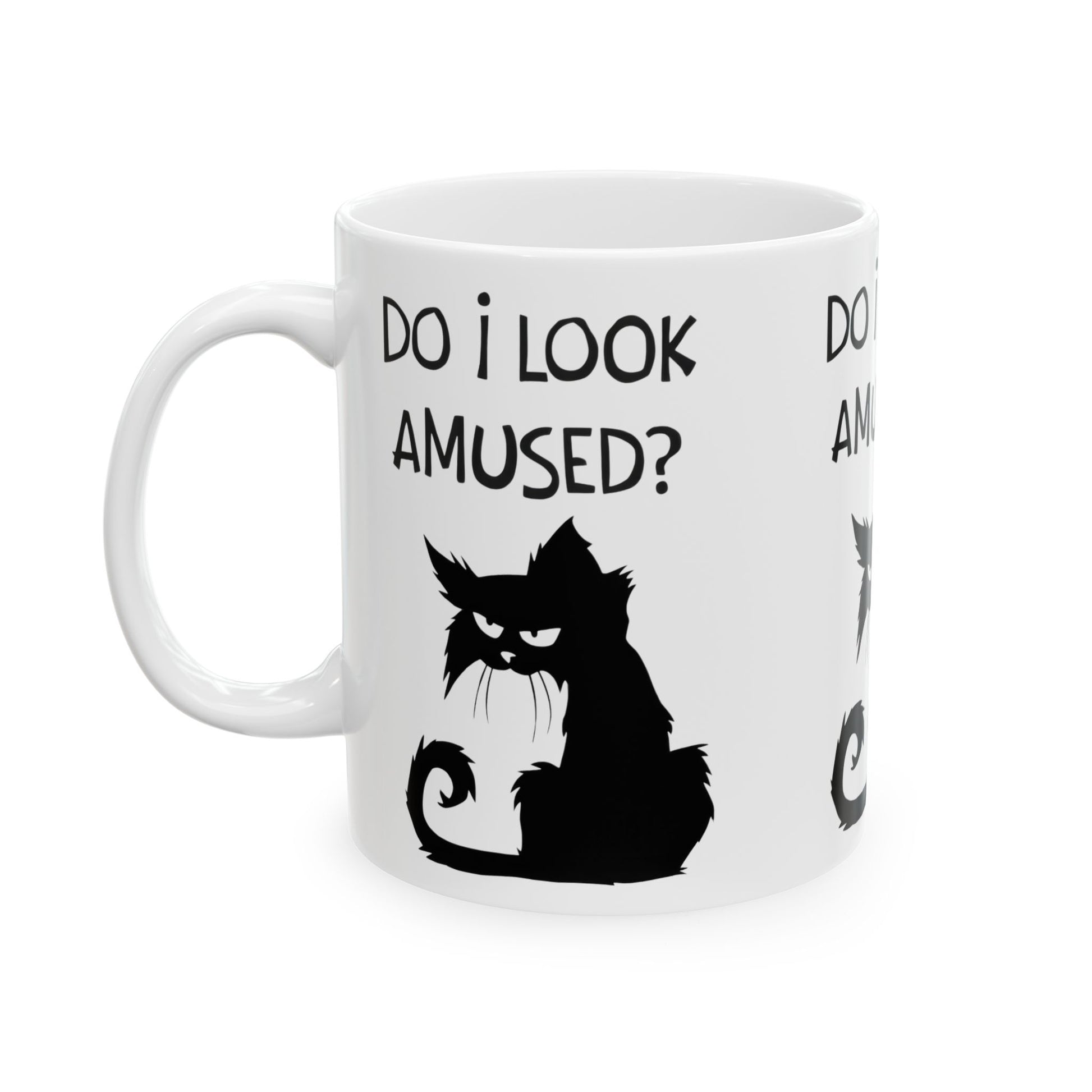 This glossy ceramic mug carries a sly, sassy vibe — a black silhouette cat with a raised tail and narrowed eyes asks, "Do I look amused?" It’s the kind of mug that makes mornings a little wry: bold monochrome art pops against the bright white ceramic, and the clear, cheeky message lands without being overstated. Use it for a slow coffee while you wake up, set it on your home office desk when meetings start, or keep it in the kitchen as a small daily reminder that some moods don’t need explanation. Comfortable C-handle, vibrant print, and a shiny finish make it attractive and practical for everyday use.
